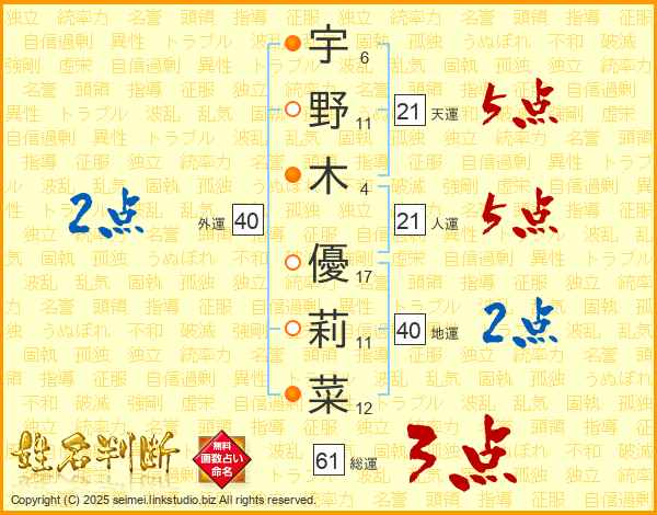 宇(6画)野(11画)木(4画) 優(17画)莉(11画)菜(12画)