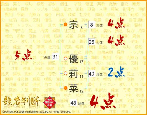 宗(8画) 優(17画)莉(11画)菜(12画)