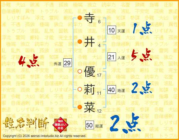 寺(6画)井(4画) 優(17画)莉(11画)菜(12画)