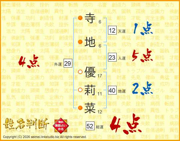 寺(6画)地(6画) 優(17画)莉(11画)菜(12画)