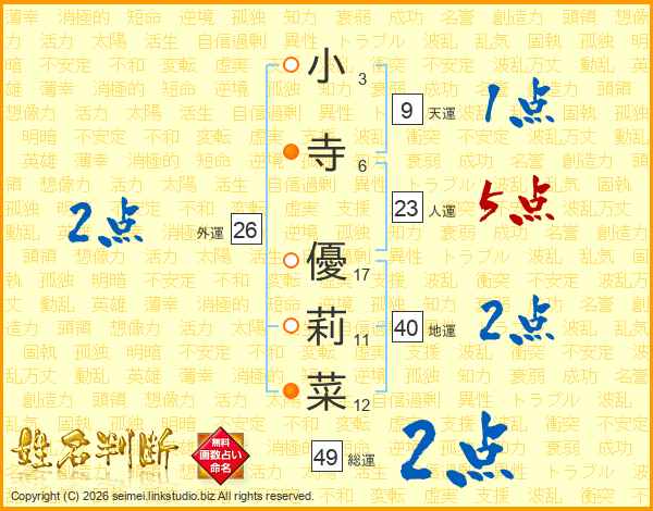 小(3画)寺(6画) 優(17画)莉(11画)菜(12画)