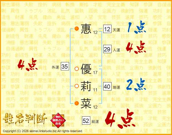 惠(12画) 優(17画)莉(11画)菜(12画)