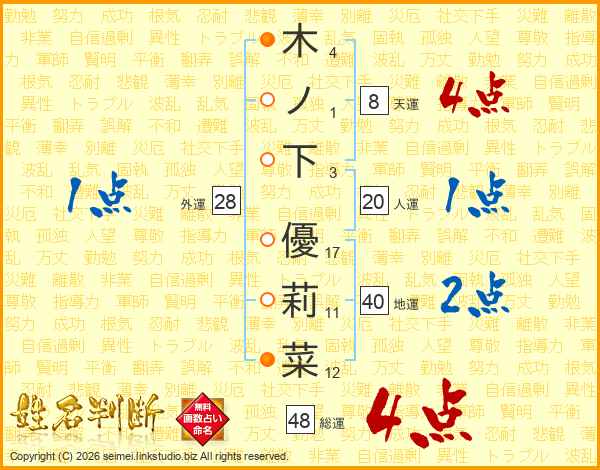 木(4画)ノ(1画)下(3画) 優(17画)莉(11画)菜(12画)