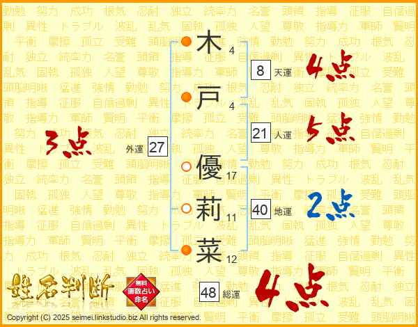木(4画)戸(4画) 優(17画)莉(11画)菜(12画)
