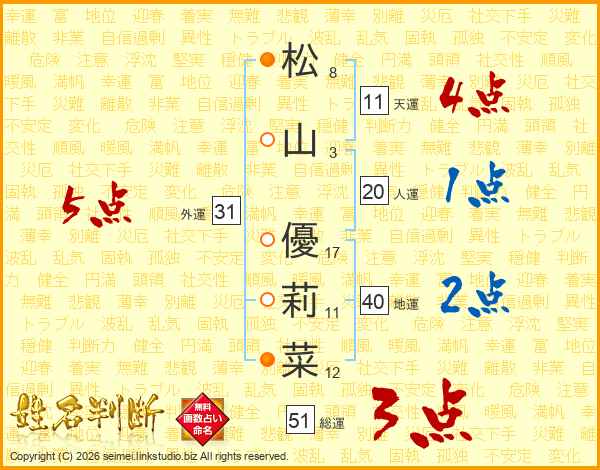 松山優莉菜さんの総運は51画の3点!