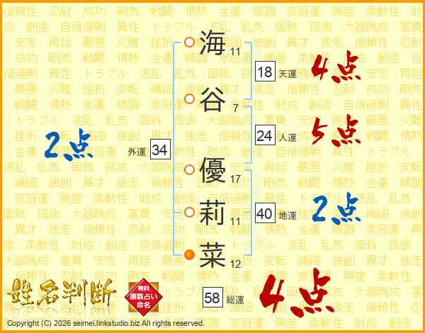 海(11画)谷(7画) 優(17画)莉(11画)菜(12画)
