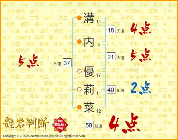 溝(14画)内(4画) 優(17画)莉(11画)菜(12画)