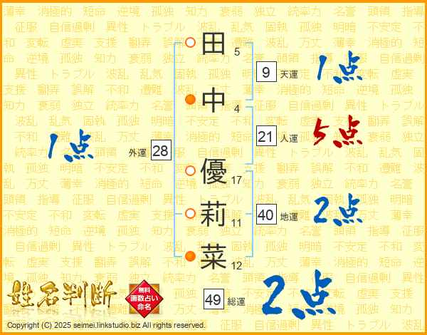 田(5画)中(4画) 優(17画)莉(11画)菜(12画)