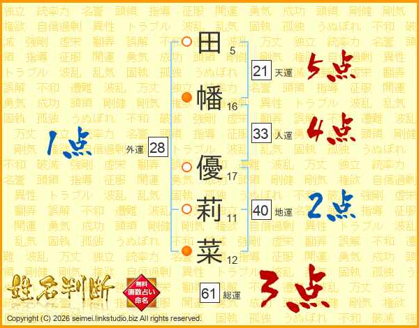 田(5画)幡(16画) 優(17画)莉(11画)菜(12画)