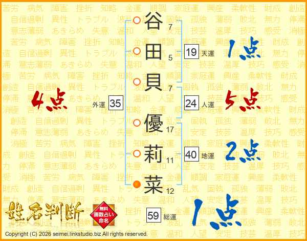 谷(7画)田(5画)貝(7画) 優(17画)莉(11画)菜(12画)