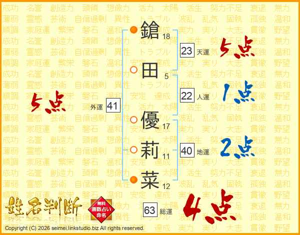 鎗(18画)田(5画) 優(17画)莉(11画)菜(12画)