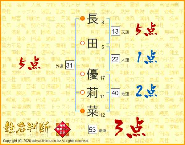 長(8画)田(5画) 優(17画)莉(11画)菜(12画)