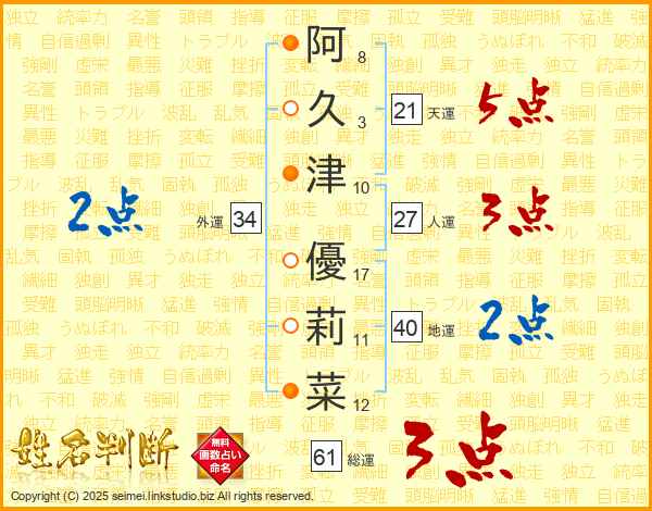 阿(8画)久(3画)津(10画) 優(17画)莉(11画)菜(12画)