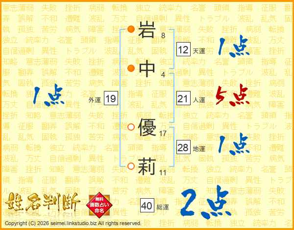生活面を象徴する運勢です。外部から受ける影響力を表し、結婚運、家庭運や職場、環境への順応性を表します。総運から人運を引いた画数。姓や名が1文字の場合を除く。