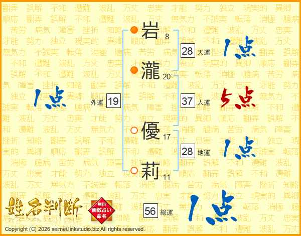 岩(8画)瀧(20画) 優(17画)莉(11画)