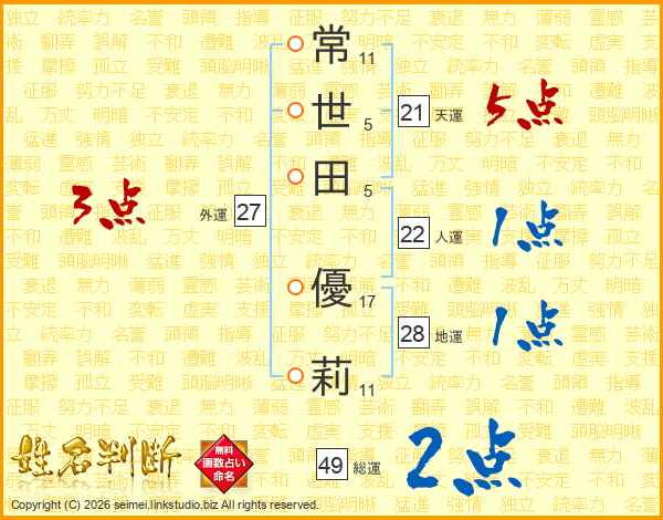 常(11画)世(5画)田(5画) 優(17画)莉(11画)