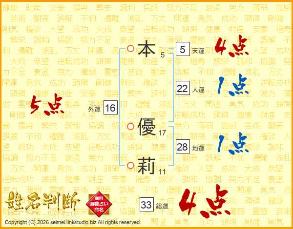 本(5画) 優(17画)莉(11画)