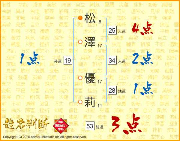生活面を象徴する運勢です。外部から受ける影響力を表し、結婚運、家庭運や職場、環境への順応性を表します。総運から人運を引いた画数。姓や名が1文字の場合を除く。