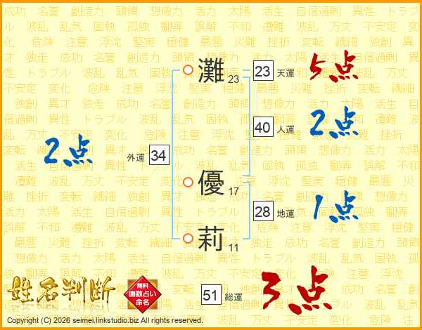 灘(23画) 優(17画)莉(11画)