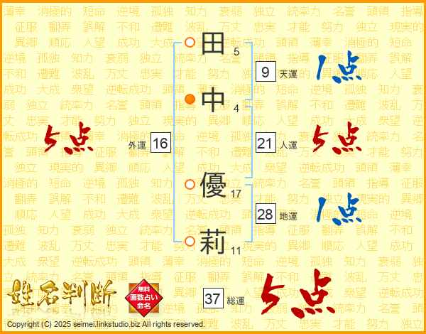 生活面を象徴する運勢です。外部から受ける影響力を表し、結婚運、家庭運や職場、環境への順応性を表します。総運から人運を引いた画数。姓や名が1文字の場合を除く。