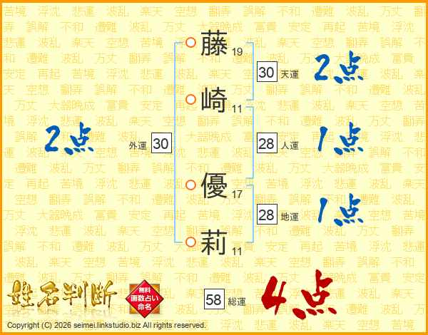 藤(19画)崎(11画) 優(17画)莉(11画)