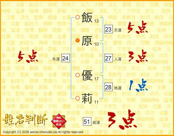 生活面を象徴する運勢です。外部から受ける影響力を表し、結婚運、家庭運や職場、環境への順応性を表します。総運から人運を引いた画数。姓や名が1文字の場合を除く。