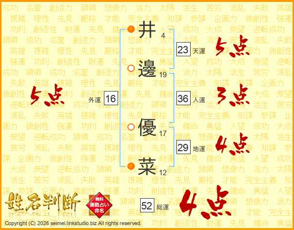 井(4画)邊(19画) 優(17画)菜(12画)