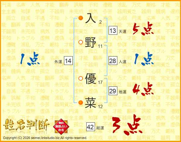 生活面を象徴する運勢です。外部から受ける影響力を表し、結婚運、家庭運や職場、環境への順応性を表します。総運から人運を引いた画数。姓や名が1文字の場合を除く。