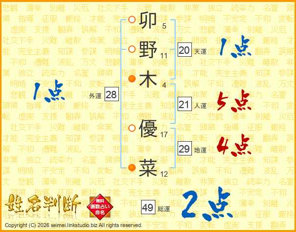 卯(5画)野(11画)木(4画) 優(17画)菜(12画)
