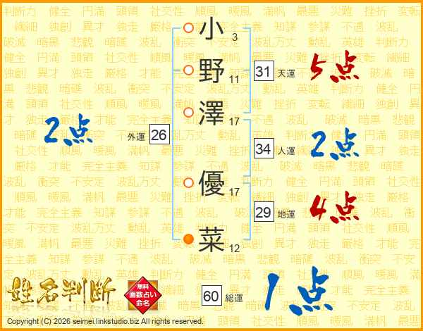 小(3画)野(11画)澤(17画) 優(17画)菜(12画)