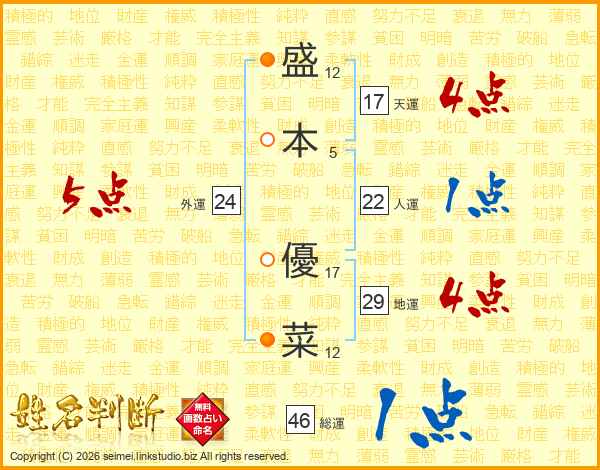盛(12画)本(5画) 優(17画)菜(12画)