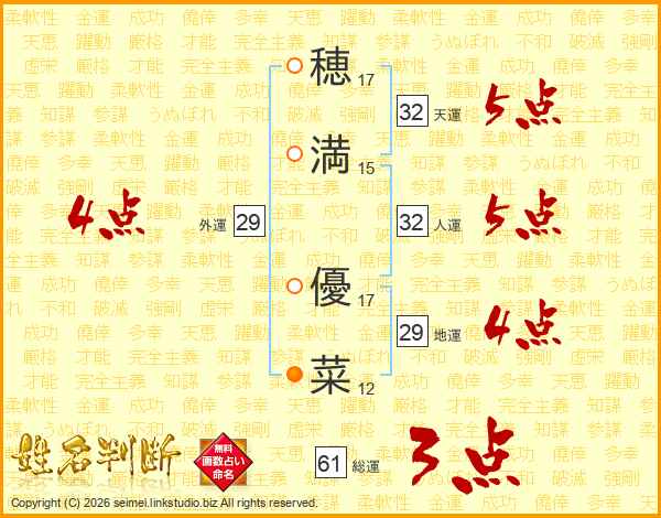 穂(17画)満(15画) 優(17画)菜(12画)