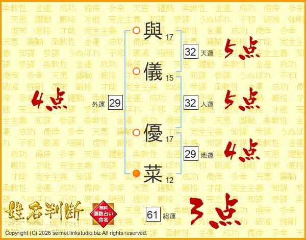 生活面を象徴する運勢です。外部から受ける影響力を表し、結婚運、家庭運や職場、環境への順応性を表します。総運から人運を引いた画数。姓や名が1文字の場合を除く。