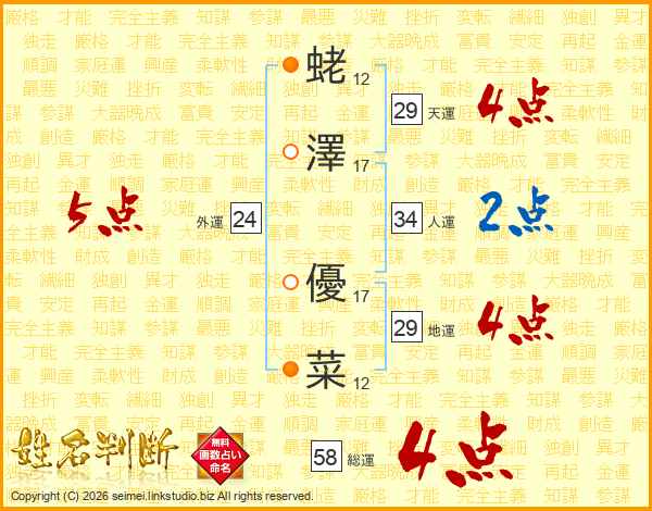 蛯(12画)澤(17画) 優(17画)菜(12画)
