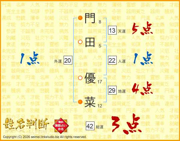 門(8画)田(5画) 優(17画)菜(12画)