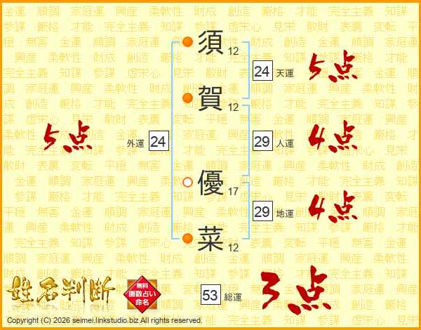 須(12画)賀(12画) 優(17画)菜(12画)