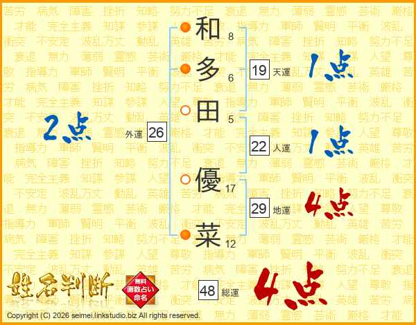 和(8画)多(6画)田(5画) 優(17画)菜(12画)