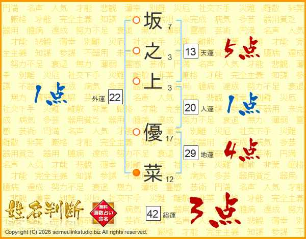 坂(7画)之(3画)上(3画) 優(17画)菜(12画)