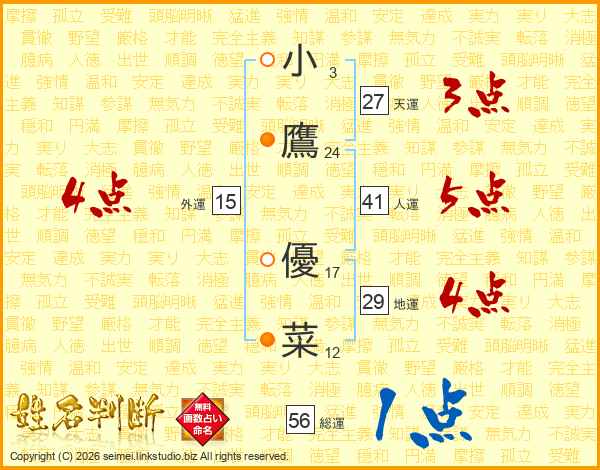 小(3画)鷹(24画) 優(17画)菜(12画)