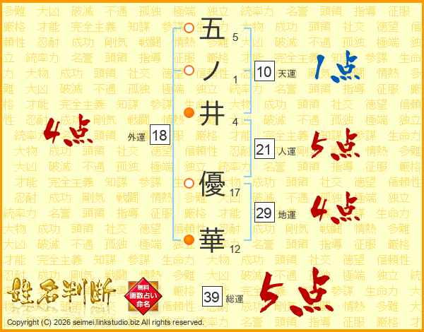 五(5画)ノ(1画)井(4画) 優(17画)華(12画)