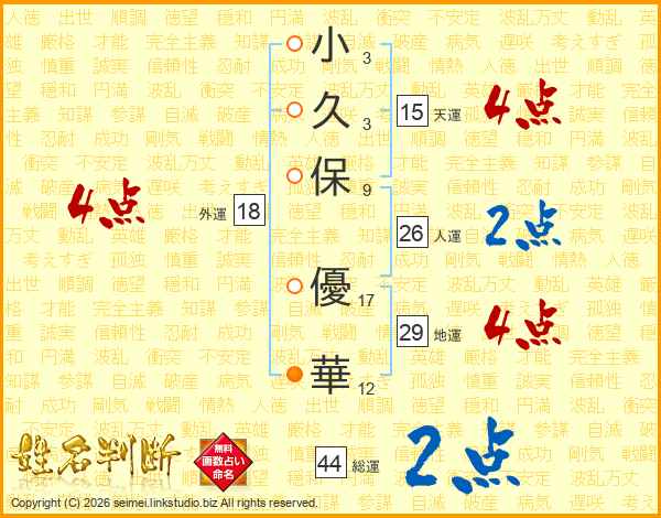 小(3画)久(3画)保(9画) 優(17画)華(12画)