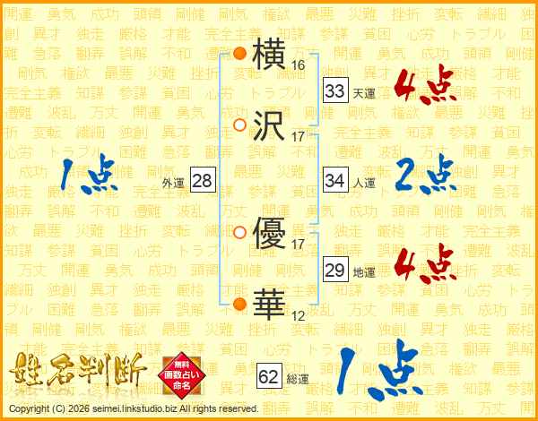 生活面を象徴する運勢です。外部から受ける影響力を表し、結婚運、家庭運や職場、環境への順応性を表します。総運から人運を引いた画数。姓や名が1文字の場合を除く。