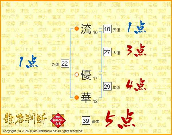 流(10画) 優(17画)華(12画)