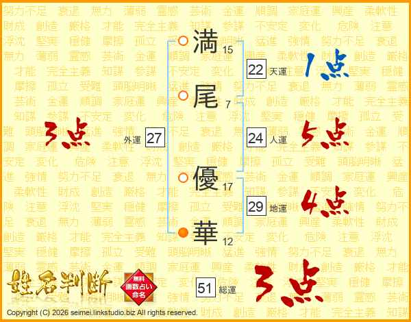 満(15画)尾(7画) 優(17画)華(12画)