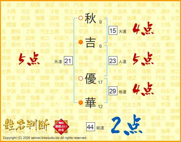 秋(9画)吉(6画) 優(17画)華(12画)