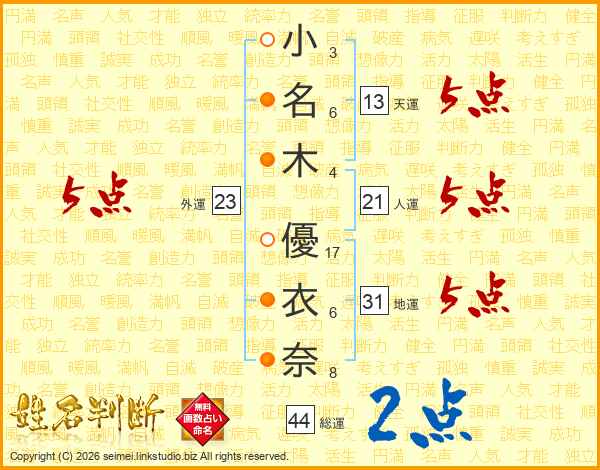 小(3画)名(6画)木(4画) 優(17画)衣(6画)奈(8画)