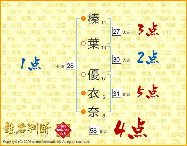 榛葉優衣奈さんの総運は58画の4点!