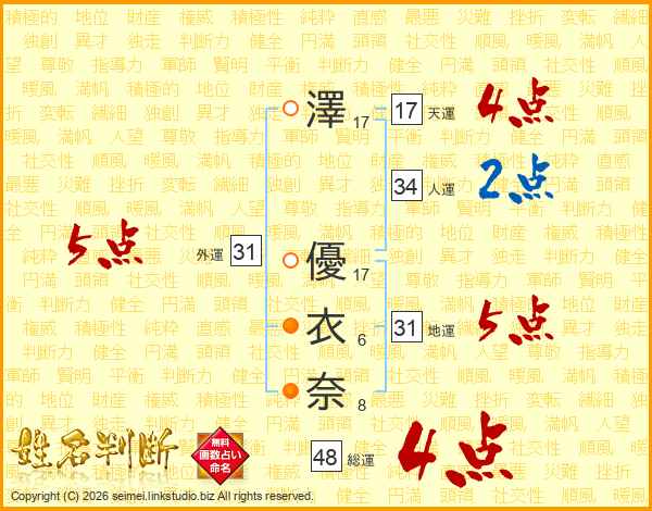 澤(17画) 優(17画)衣(6画)奈(8画)