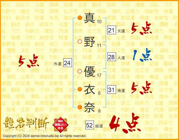 真(10画)野(11画) 優(17画)衣(6画)奈(8画)
