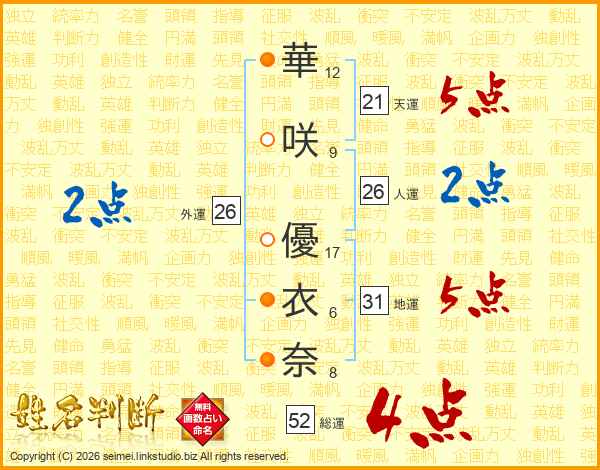 華(12画)咲(9画) 優(17画)衣(6画)奈(8画)